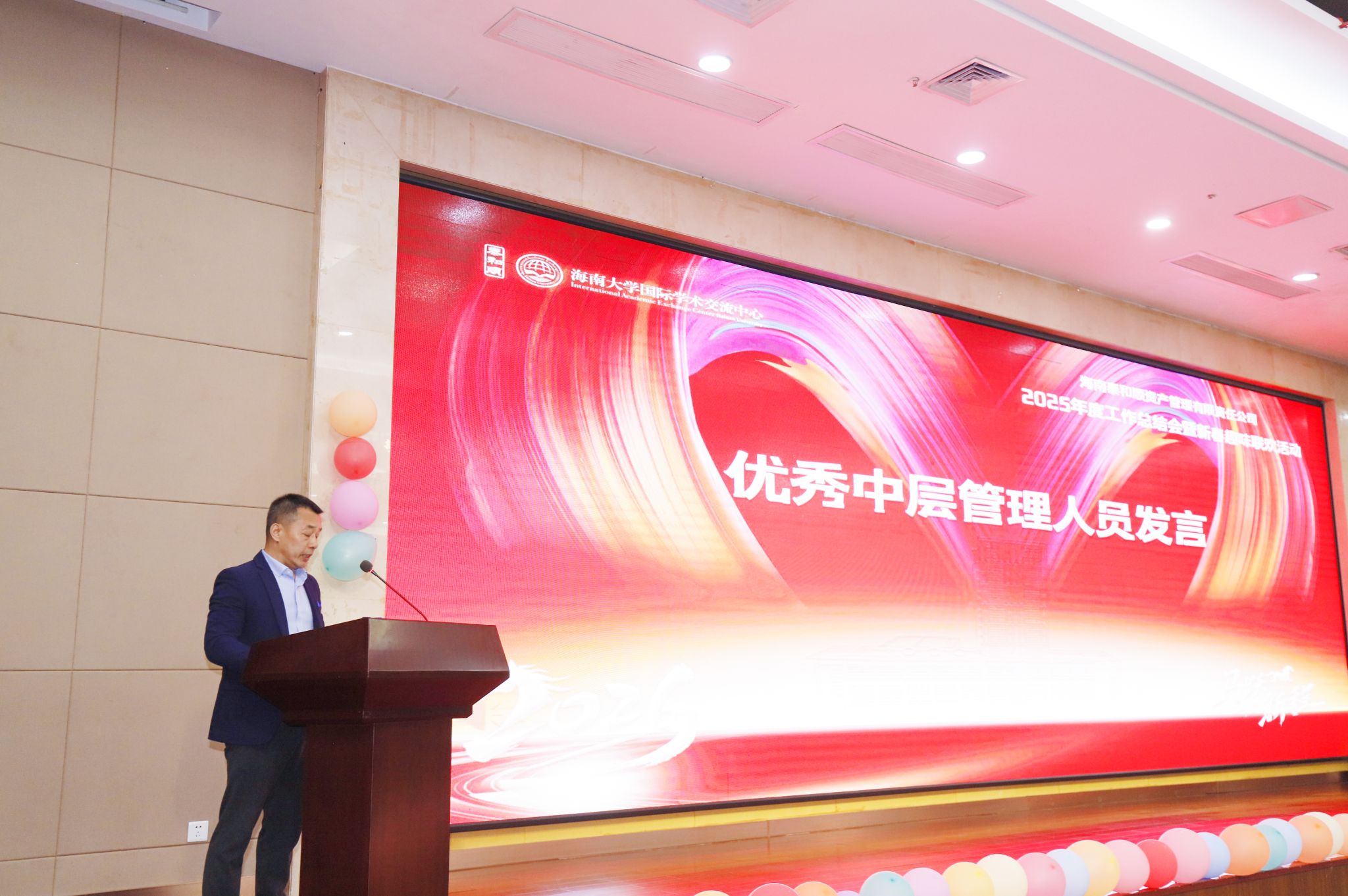 高佃恭在讲话中对公司2025年度取得的优异经营业绩和各项工作成效给予充分肯定,向全体员工的辛勤付出表示诚挚慰问。他指出,公司作为服务学校发展、助力自贸港建设的重要力量,要始终坚守以“五心”服务建“全球专家学者的海南之家”的初心使命,紧紧围绕海南大学建设综合性研究型国际化“双一流”大学的战略目标,主动对接海南自贸港封关运作的重大部署,进一步强化主体意识、提升服务效能、彰显责任担当,不断提供更有温度、更具保障、更显价值的接待服务,为学校事业发展大局和自贸港建设贡献更大力量。
